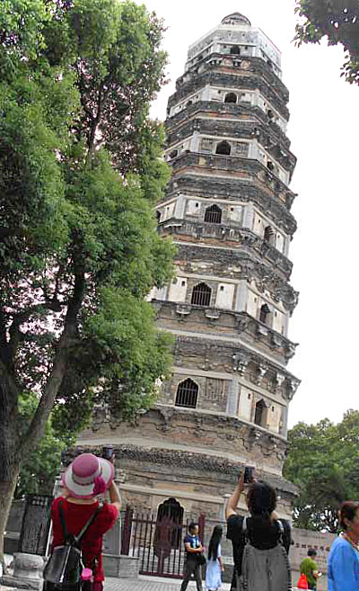 八角7層のれんが造りで高さは47.7m。明代以降、地盤沈下により傾き始め、